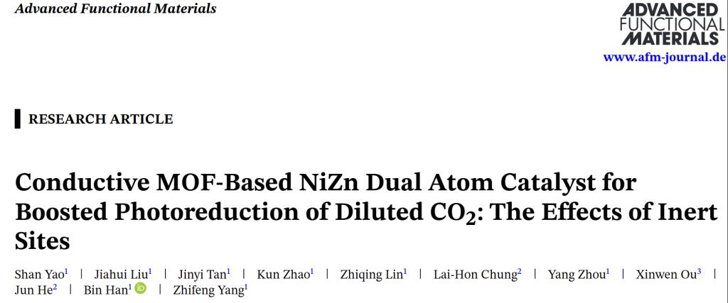 杨志峰院士团队韩彬教授课题组在人为源二氧化碳转化研究中取得重要进展,研究成果以“Conductive MOF-Based NiZn Dual Atom Catalyst for Boosted Photoreduction of Diluted CO2: The Effects of Inert Sites”为题发表于《Advanced Functional Materials》。韩彬教授为论文通讯作者,91自拍